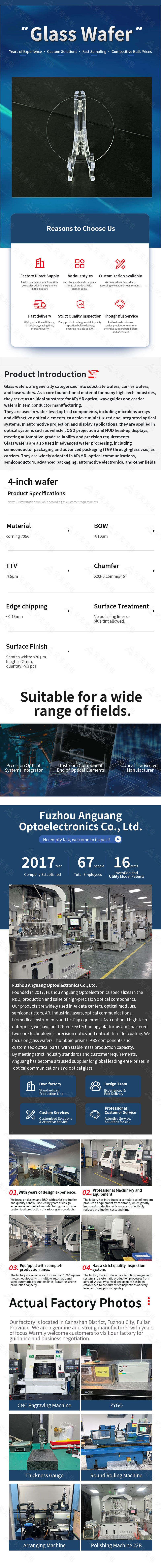 تأسست شركة Fuzhou Anguang Optoelectronics Co., Ltd. في عام 2017، وتعمل بشكل رئيسي في إنتاج وبيع مختلف المكونات البصرية الدقيقة. تُستخدم منتجاتنا على نطاق واسع في مراكز بيانات الذكاء الاصطناعي، والوحدات البصرية، وأشباه الموصلات، والواقع المعزز، والليزر الصناعي، والاتصالات البصرية، والطب الحيوي، وأدوات الاختبار والتحليل، والعديد من المجالات الصناعية الأخرى. لقد تم الاعتراف بشركة Anguang Optoelectronics كمؤسسة ذات تقنية عالية. أنشأت الشركة ثلاث منصات تكنولوجية رئيسية وتمتلك تقنيتين أساسيتين. منصات التكنولوجيا الثلاث هي منصة تصنيع الرقاقات الزجاجية، ومنصة تصنيع الأغشية الرقيقة البصرية، ومنصة تصنيع المنشور البصري. التقنيتان الأساسيتان هما التكنولوجيا البصرية الدقيقة وتقنية الأغشية الرقيقة البصرية. من بينها، التكنولوجيا البصرية الدقيقة هي تكنولوجيا إنتاج متخصصة يتم تطبيقها على المكونات البصرية المستوية، والتي تركز على التلميع على الوجهين ويكملها التلميع الكلاسيكي. تُستخدم تقنية الأغشية الرقيقة الضوئية بشكل أساسي في عملية إنتاج الطلاء، وهي خطوة حاسمة للمكونات البصرية الدقيقة لتحقيق وظائف محددة. استنادًا إلى سنوات من التراكم الفني، قامت الشركة بتشكيل أربع سلاسل منتجات رئيسية: الرقائق الزجاجية، والمنشورات المعينية، وتجميعات PBS، والمكونات ذات الأشكال الخاصة. من خلال التركيز على احتياجات...