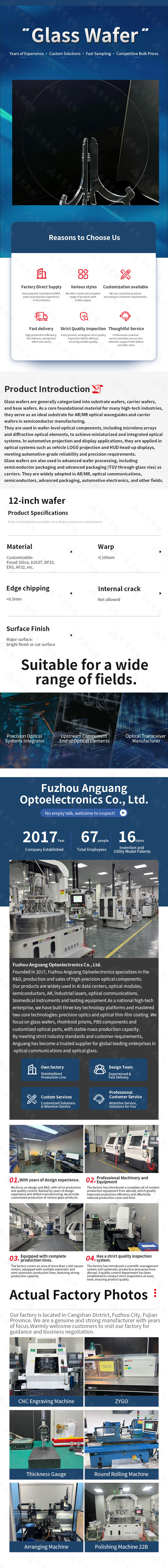 تأسست شركة Fuzhou Anguang Optoelectronics Co., Ltd. في عام 2017، وتعمل بشكل رئيسي في إنتاج وبيع مختلف المكونات البصرية الدقيقة. تُستخدم منتجاتنا على نطاق واسع في مراكز بيانات الذكاء الاصطناعي، والوحدات البصرية، وأشباه الموصلات، والواقع المعزز، والليزر الصناعي، والاتصالات البصرية، والطب الحيوي، وأدوات الاختبار والتحليل، والعديد من المجالات الصناعية الأخرى. لقد تم الاعتراف بشركة Anguang Optoelectronics كمؤسسة ذات تقنية عالية. أنشأت الشركة ثلاث منصات تكنولوجية رئيسية وتمتلك تقنيتين أساسيتين. منصات التكنولوجيا الثلاث هي منصة تصنيع الرقاقات الزجاجية، ومنصة تصنيع الأغشية الرقيقة البصرية، ومنصة تصنيع المنشور البصري. التقنيتان الأساسيتان هما التكنولوجيا البصرية الدقيقة وتقنية الأغشية الرقيقة البصرية. من بينها، التكنولوجيا البصرية الدقيقة هي تكنولوجيا إنتاج متخصصة يتم تطبيقها على المكونات البصرية المستوية، والتي تركز على التلميع على الوجهين ويكملها التلميع الكلاسيكي. تُستخدم تقنية الأغشية الرقيقة الضوئية بشكل أساسي في عملية إنتاج الطلاء، وهي خطوة حاسمة للمكونات البصرية الدقيقة لتحقيق وظائف محددة. استنادًا إلى سنوات من التراكم الفني، قامت الشركة بتشكيل أربع سلاسل منتجات رئيسية: الرقائق الزجاجية، والمنشورات المعينية، وتجميعات PBS، والمكونات ذات الأشكال الخاصة. من خلال التركيز على احتياجات...